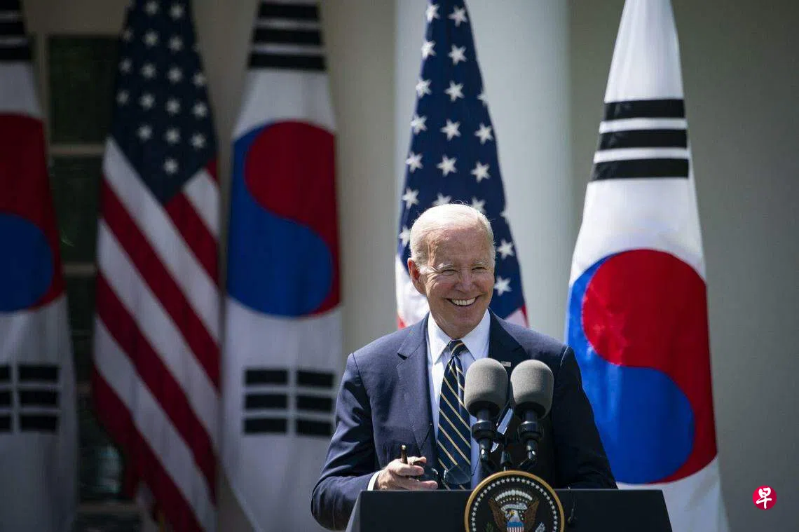 路透社报道,拜登星期三(4月26日)在发起竞选连任一天后,在白宫玫瑰园与韩国总统尹锡悦举行联合新闻发布会。