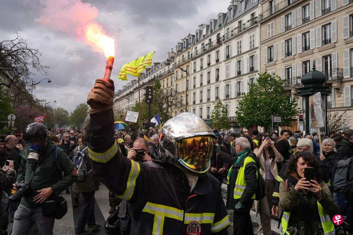 示威者在愈演愈烈的抗议活动中焚烧自行车和建筑物等、高举烟雾棒和抗议标语,反对法国总统马克龙势在必行的养老金改革。