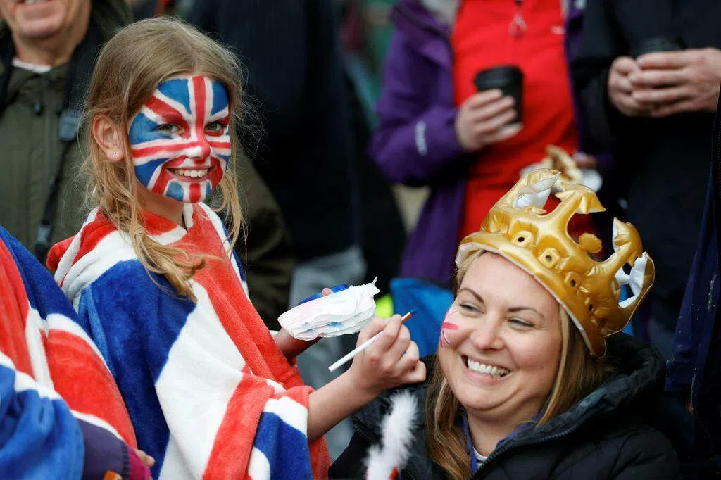 综合外电报道,从星期六凌晨时分,陆陆续续就有身穿红、白、蓝三色衣服、手持旗帜的民众聚集在伦敦街道上,形成一排排的队伍等待观看王室游行。