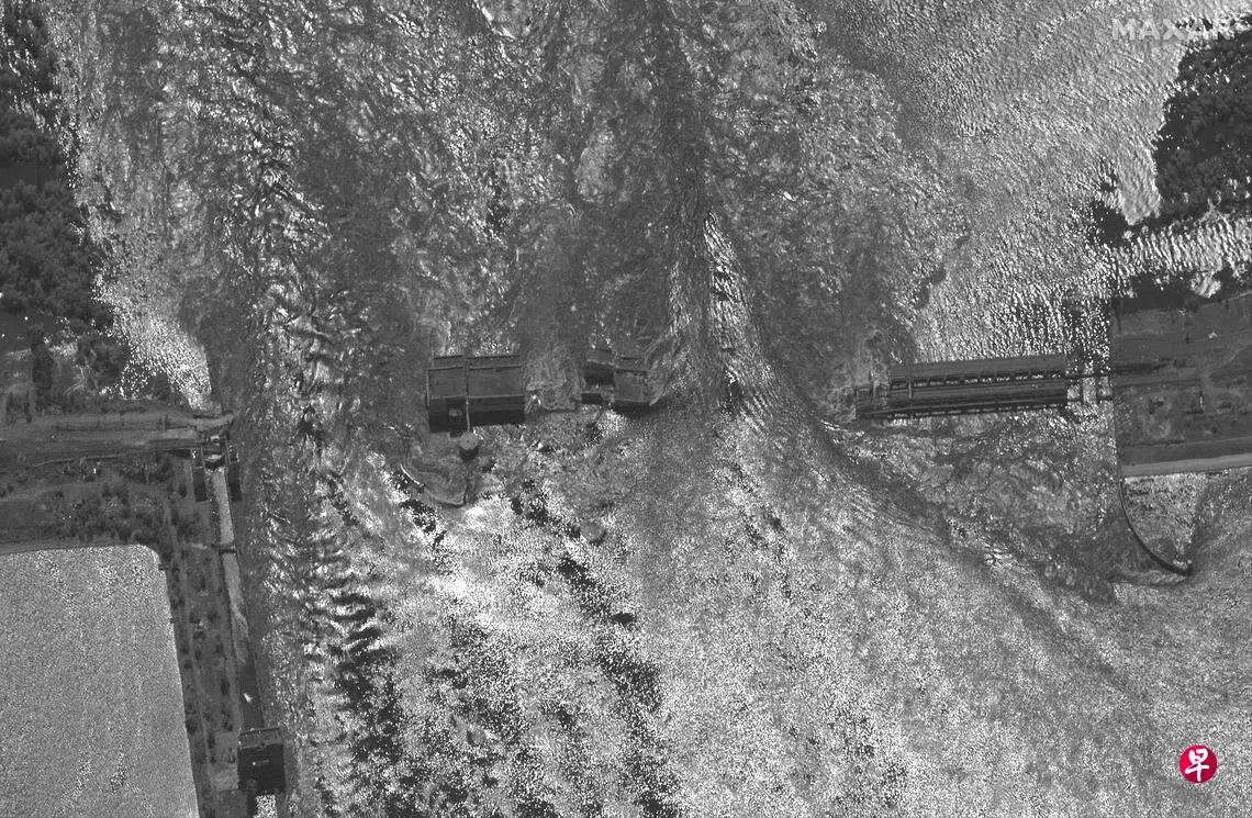 美国卫星图像公司Maxar Technologies星期二下午拍摄的卫星图像显示,洪水淹没乌克兰南部大面积地区,新卡霍夫卡的水坝和水电站已大部分被摧毁。