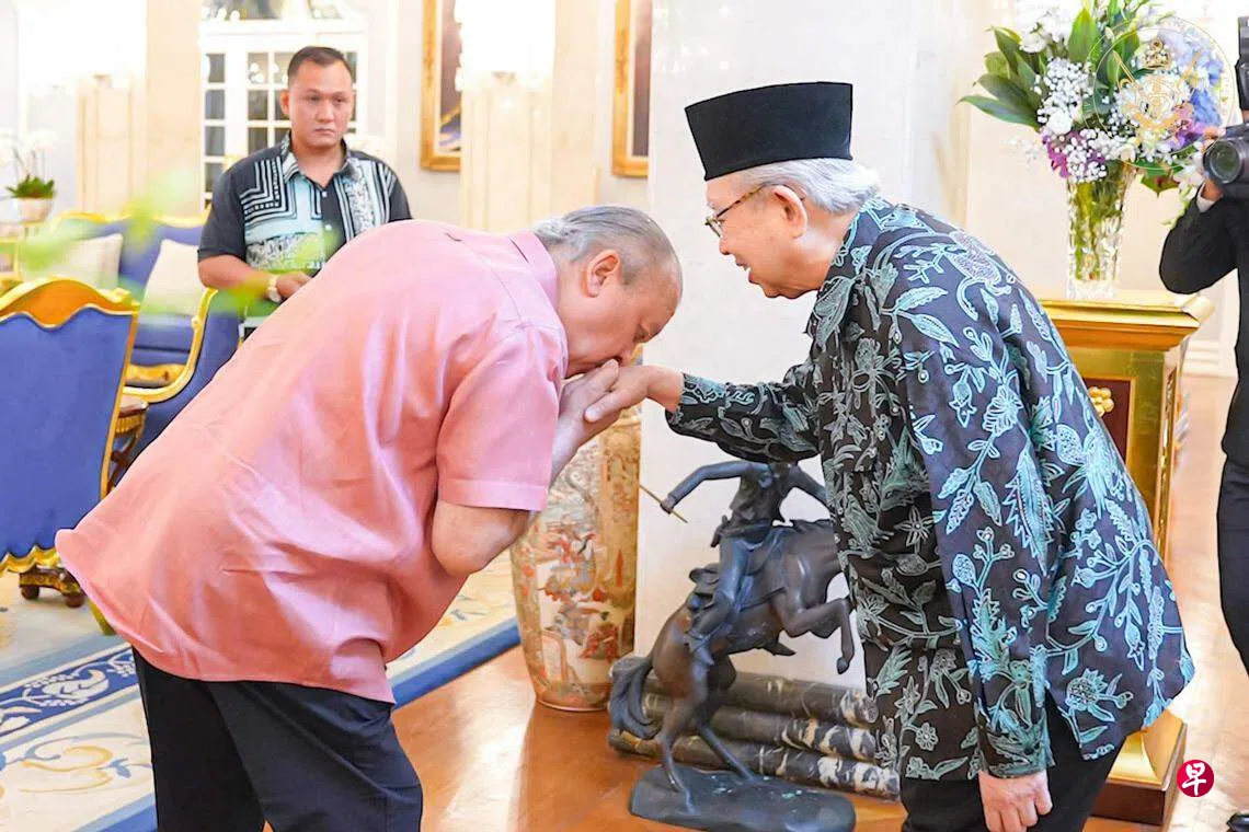 (新山综合讯)巫统元老东姑拉沙里星期一(6月26日)前往新山山武吉士林王宫会见柔佛苏丹依布拉欣。依布拉欣一见面就以晚辈身份亲吻拉沙里的右手,执礼甚恭。
