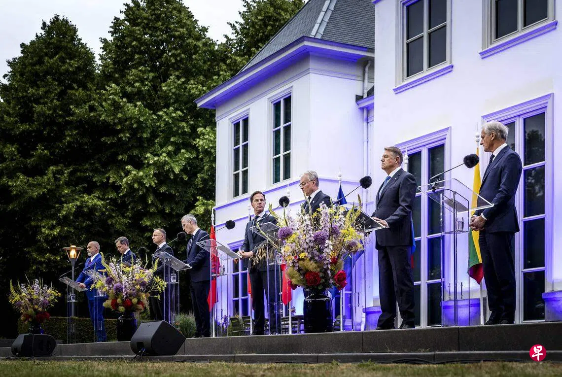 阿尔巴尼亚总理拉马、比利时首相德克罗、波兰总统杜达、北约秘书长斯托尔滕贝格、荷兰首相吕特、立陶宛总统瑙塞达,以及罗马尼亚总统约翰尼斯,6月27日在海牙荷兰首相府举行会议。