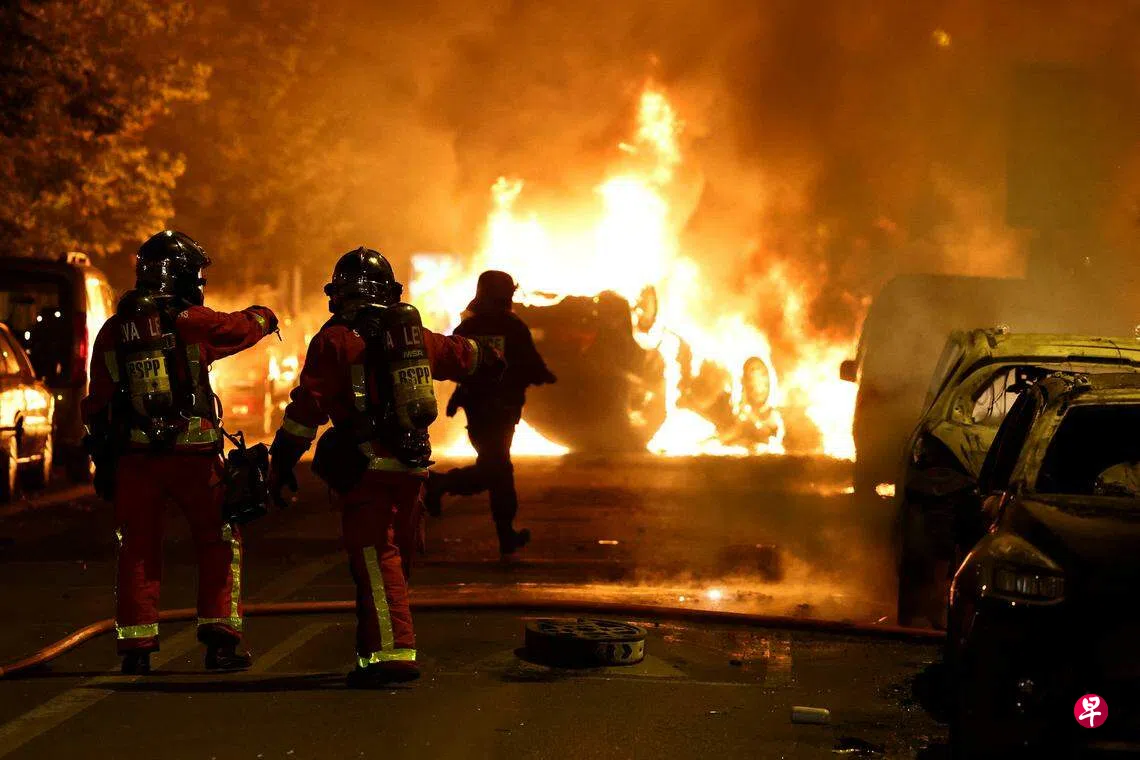 法国巴黎郊区楠泰尔(Nanterre)星期三(6月28日)连续第二晚发生骚乱,不满警方枪击一名17岁少年导致他死亡的民众上街示威,他们向警察燃放爆竹并纵火烧车,150人被捕。