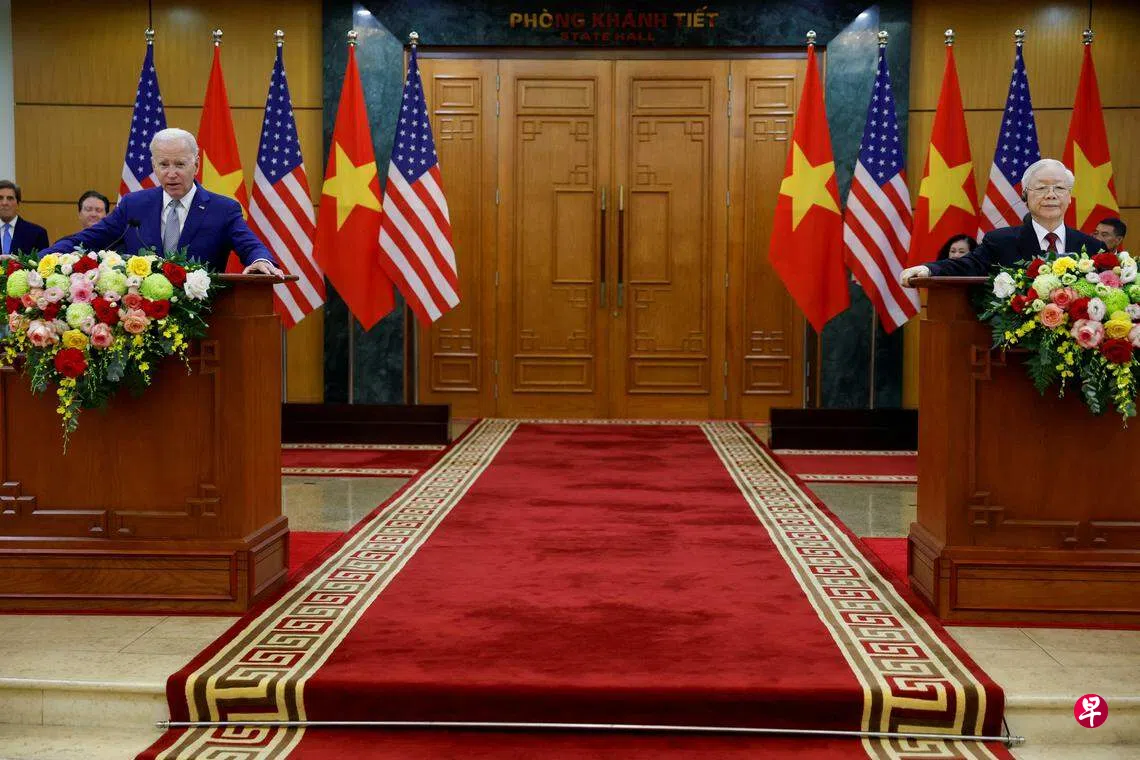 美国总统拜登抵达越南河内后称,美国和越南正深化在新兴技术、关键供应链和半导体领域的合作;越南共产党中央总书记阮富仲说,两国关系已升级为 “全面战略伙伴关系”。