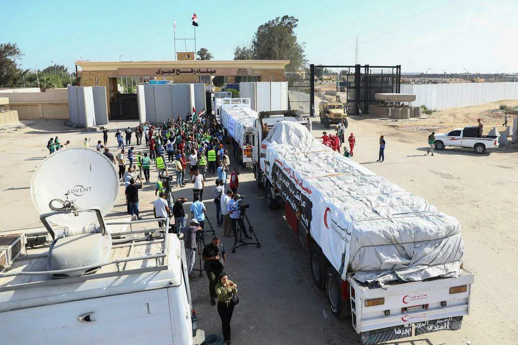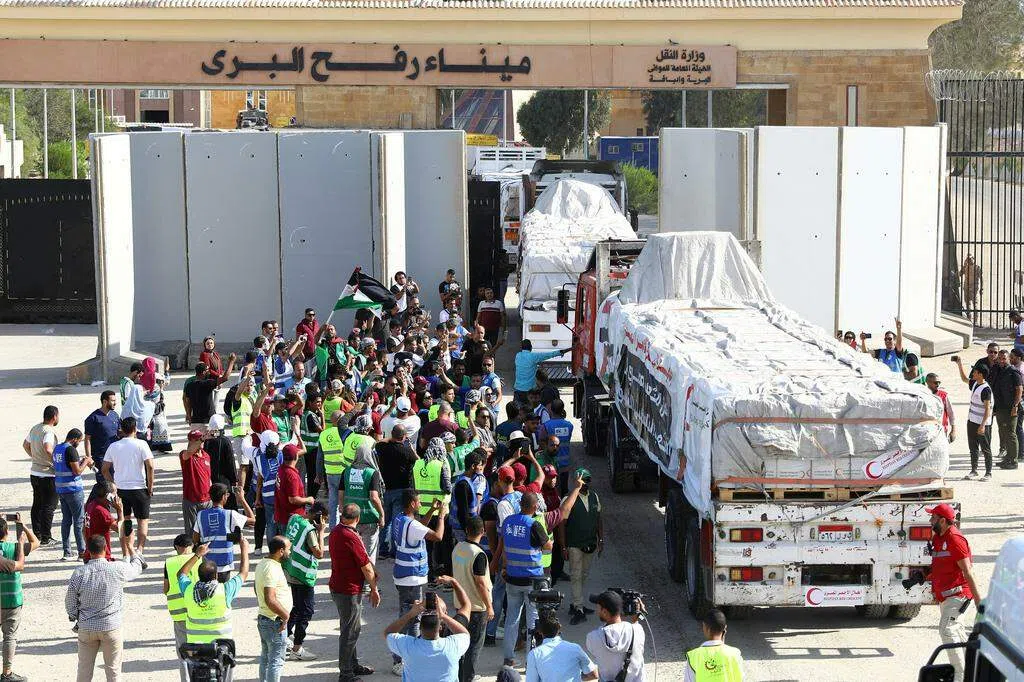 星期天(10月22日)第二批载满救援物资卡车车队成功通过拉法口岸进入加沙地带,其中还罕见包括数辆载有燃料的卡车。