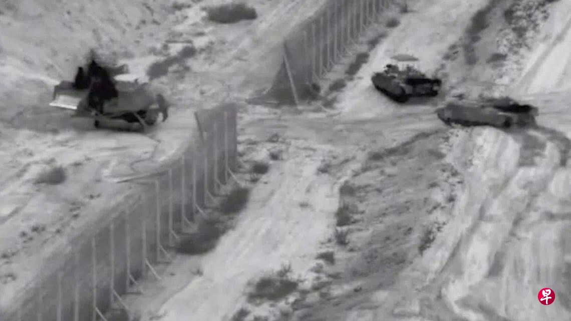 以色列国防部发布的画面显示,装甲车驶过边境地区、坦克发射炮弹,以及一排受损建筑物附近发生爆炸。