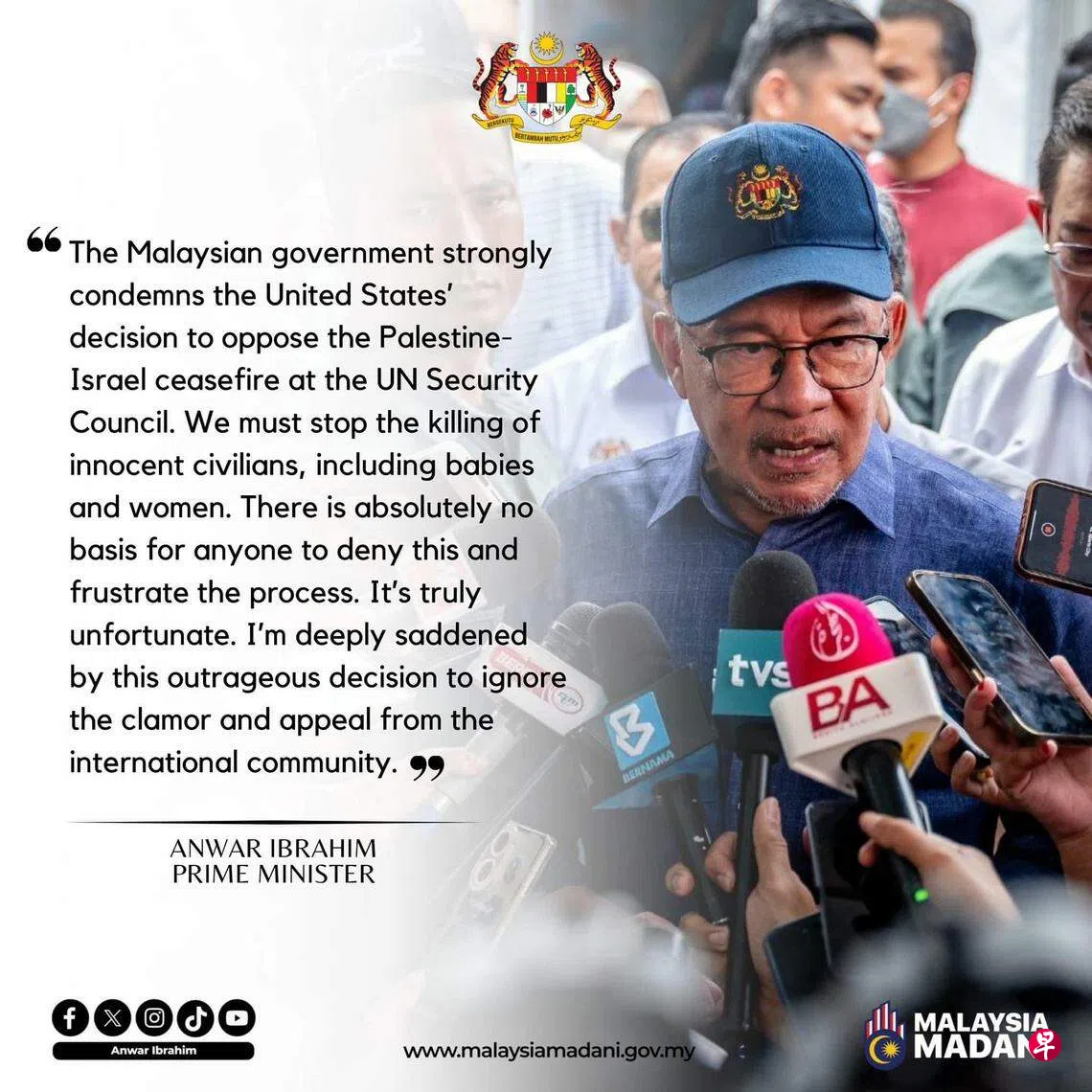 马来西亚政府强烈谴责美国否决联合国安理会呼吁以哈停火的决议,并强调各界必须立即停止对无辜平民,包括婴儿和妇女的杀害。