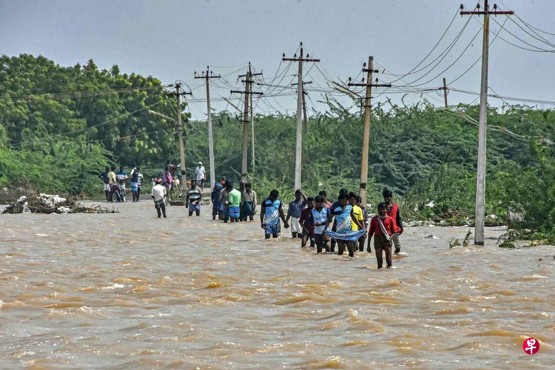 新华社报道,泰米尔纳德邦多个地区因史无前例的暴雨冲击,低洼地区被洪水淹没,并严重影响公路和铁路交通。