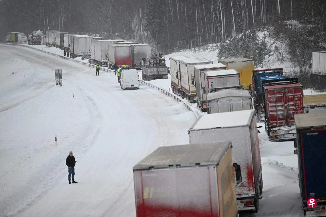 在瑞典,E22号公路的交通星期三当地时间早上9时左右(新加坡星期三下午4时)中断,大雪导致霍尔比和克里斯蒂安斯塔德之间的双向路段无法通行,数百辆汽车受困。
