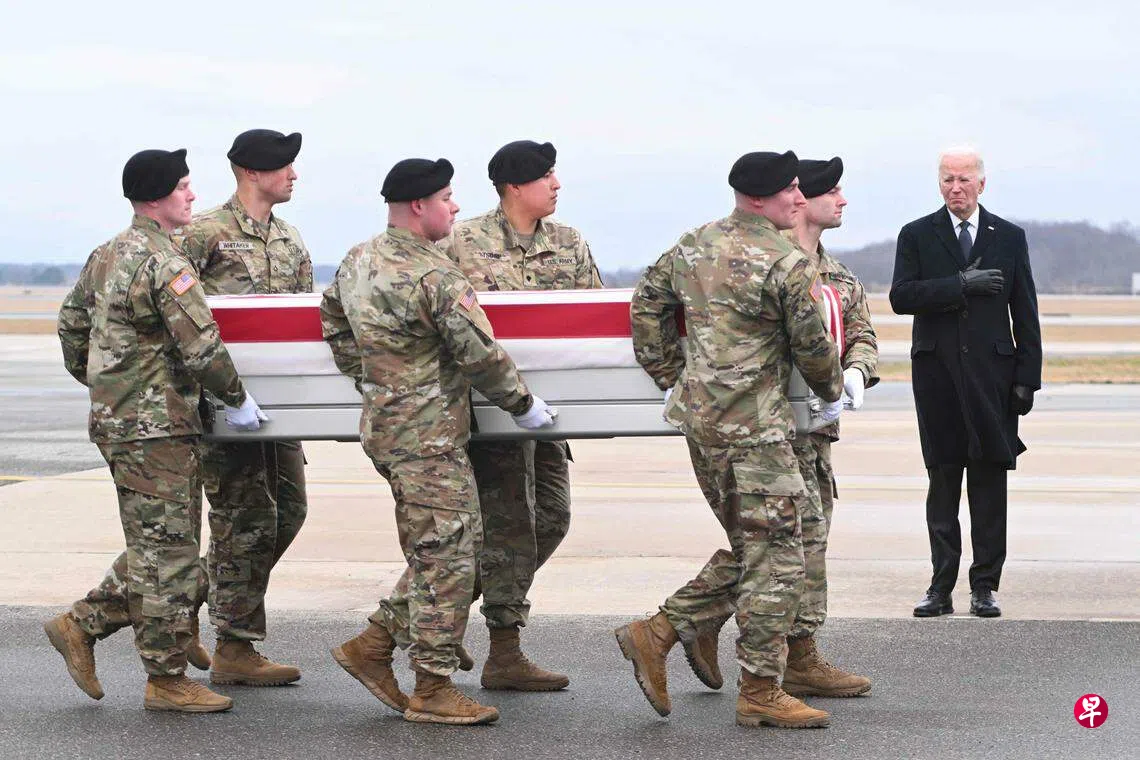 在美国对伊叙发动打击的几个小时前,在约旦军事基地遇害的三名美军遗体运抵特拉华州多佛空军基地,拜登和第一夫人吉尔·拜登、国防部长奥斯汀和五角大楼其他高官亲自到场,见证遗体转移仪式。