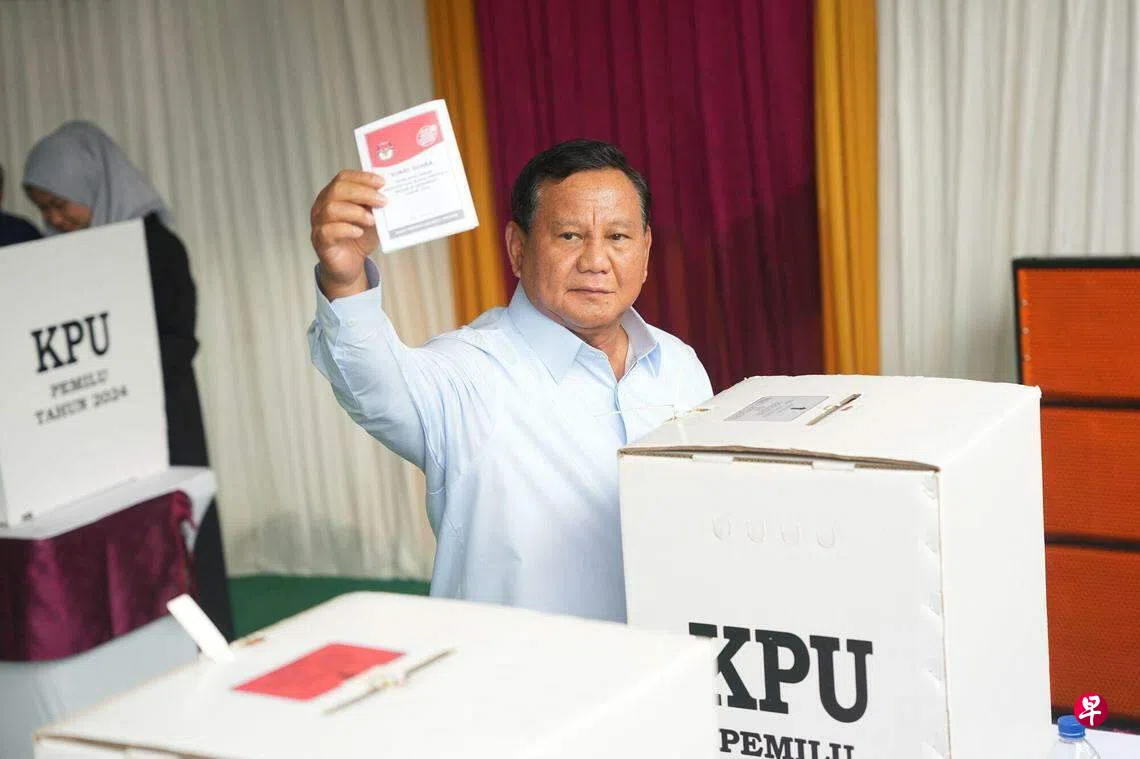 在最新民调中备受看好的印度尼西亚总统候选人普拉博沃,星期三(2月14日)上午到西爪哇省的汉巴朗(Hambalang)完成投票。