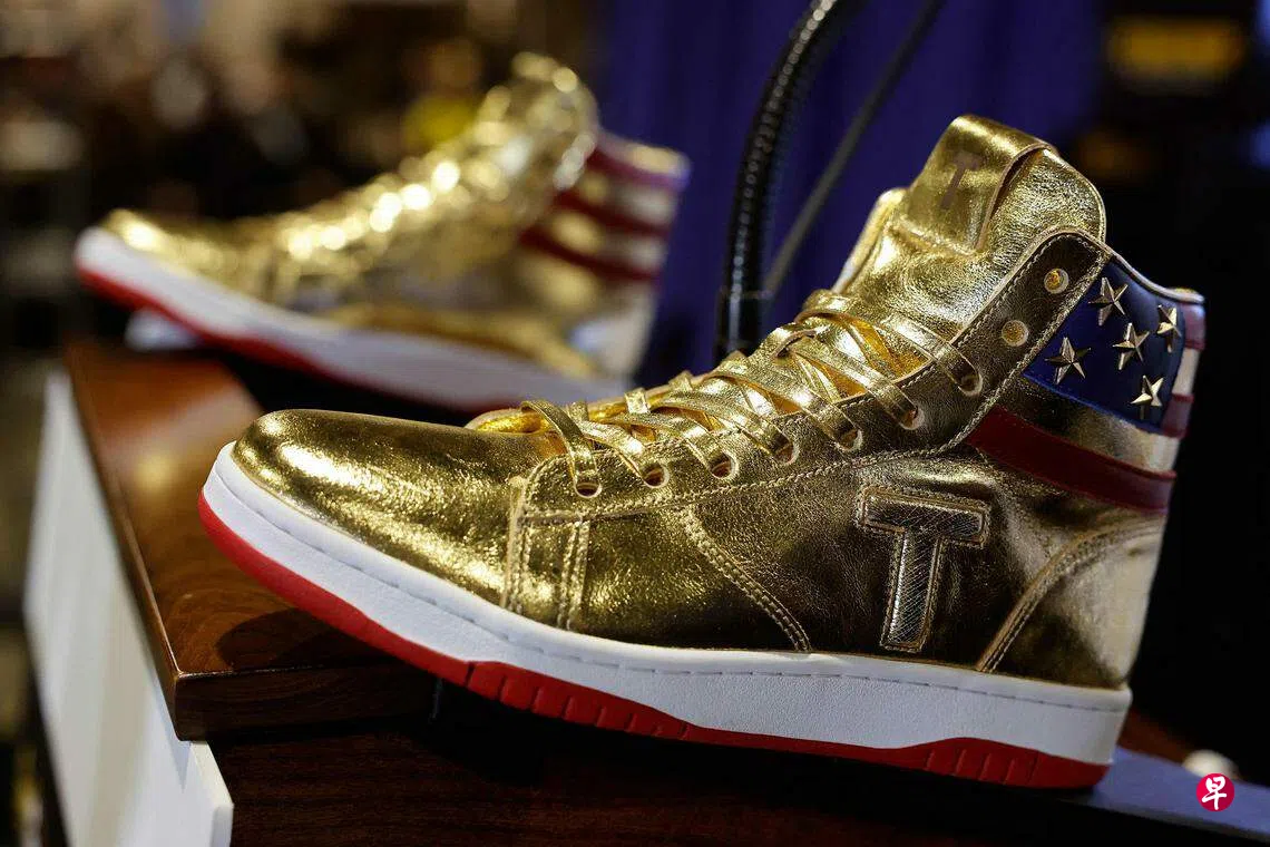 美国前总统特朗普星期六(2月17日)在费城发布的金色高帮运动鞋,在发布后几个小时就销售一空。