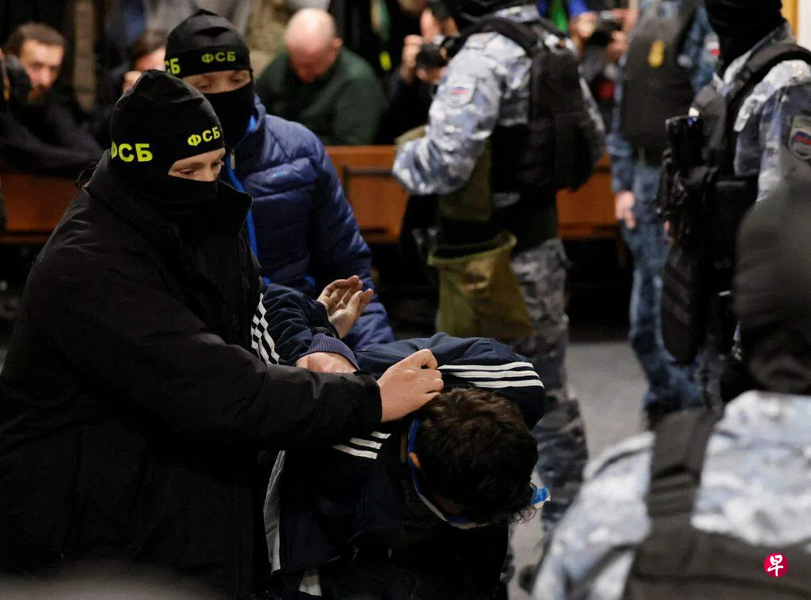 袭击发生后,俄当局逮捕了与袭击有关的11人,包括上述四名嫌犯。法庭公布的录像显示,其中三名嫌犯被警察铐上手铐、双腿弯曲着带到法庭。他们被安置在一间玻璃面牢房中。其余一名被告则坐在轮椅上,双眼紧闭。