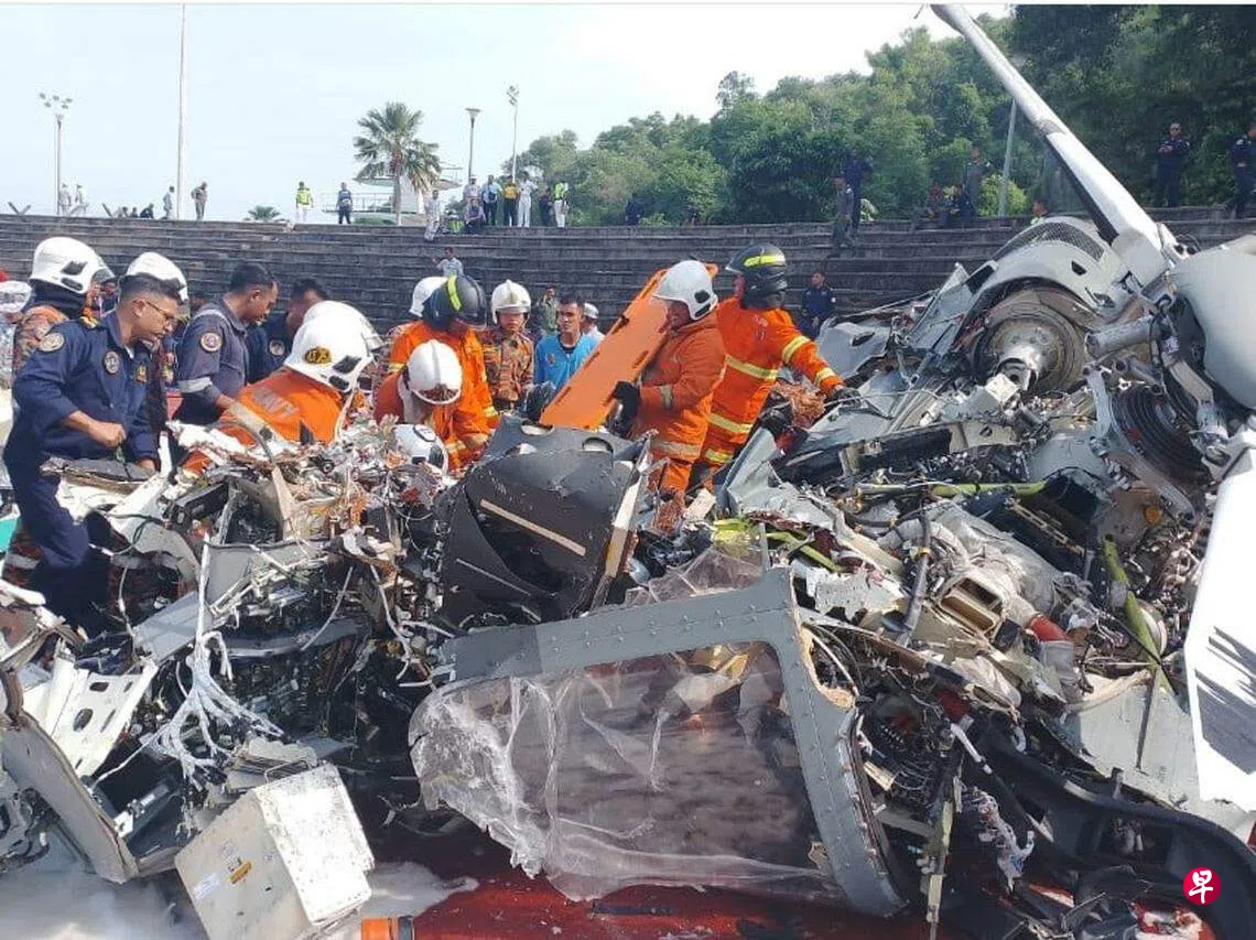 马国两架武装部队直升机星期二在霹雳州红土坎海军基地进行第90届海军建军日彩排时,在空中相撞后坠毁,10名机组人员全数罹难。