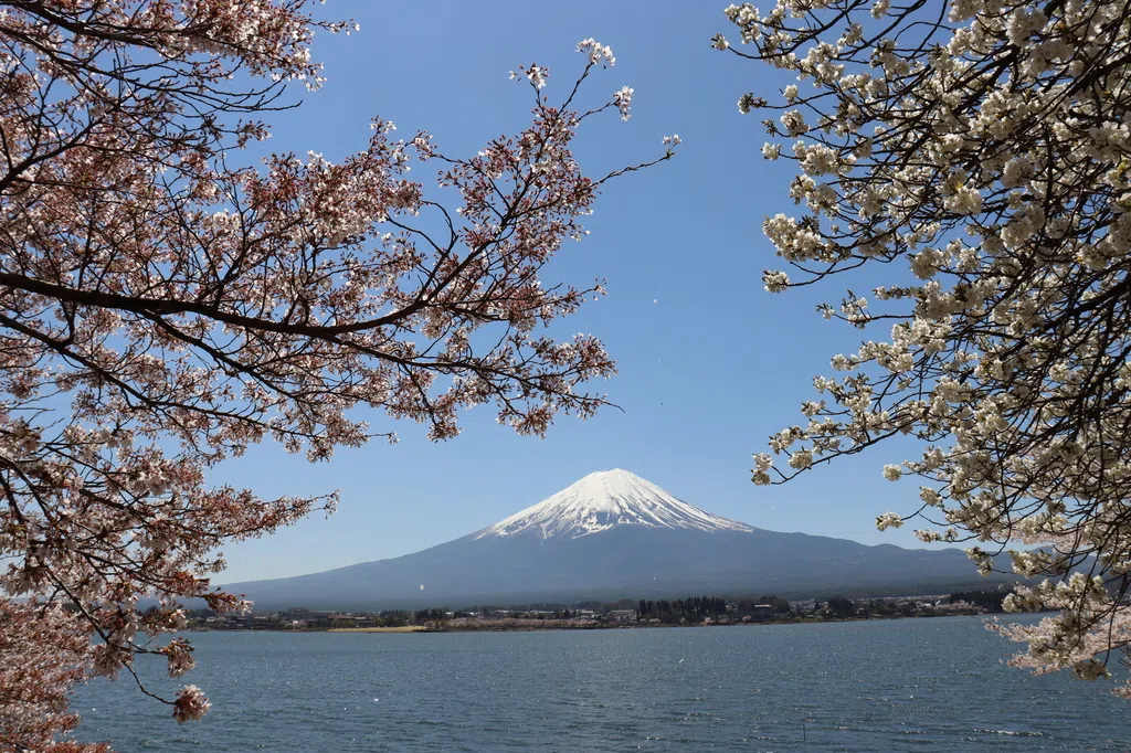 富士河口湖町坐落于富士山北侧,是由富士山火山喷发形成的五个堰塞湖“富士五湖”之一。河口湖是富士五湖中交通最便利的一个,从湖的四周都能欣赏到如明信片般优美的富士山景色。