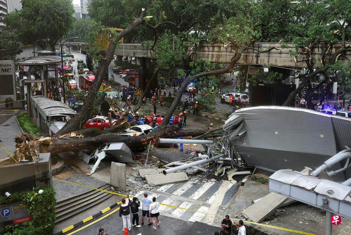 狂风暴雨袭击吉隆坡市中心,导致一棵大树轰然倒下并压住至少17辆车子,造成一人死亡一人受伤。倒下的大树也阻断道路和单轨火车轨道,让两个站点的单轨火车服务被迫暂停。