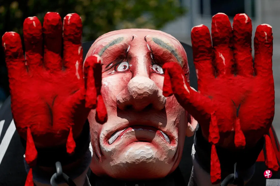 路透社报道,多名示威者星期二(5月7日)在海牙和平宫示威,有人制作了普京的巨型人像,不仅身穿条纹监狱服和双手沾满血迹,身上也被铁球压着。示威者高举乌克兰国旗,以及写着“把普京抓到海牙(监狱)”字眼的牌子等。