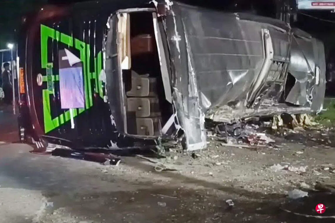 西爪哇省警方表示,事故发生在当地时间星期六傍晚6时45分(新加坡时间晚上7时45分),一辆大巴在该省苏横县一下坡路段行驶时突然右转,与一对向来的车相撞后发生侧翻,并撞向停在路边的三辆摩托车。
