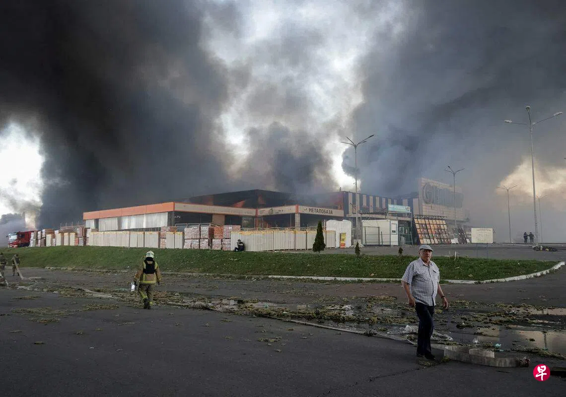 目击者在社交媒体上发布的视频显示,导弹击中的Epitsentr商店发生火灾,一股巨大的黑烟滚滚升入天空。这个连锁大卖场销售家居用品和DIY商品。