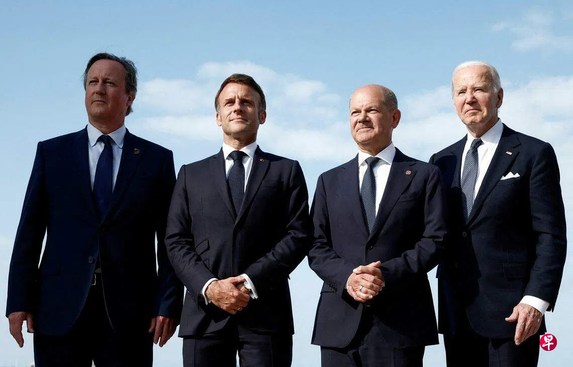 拜登星期四与欧洲国家领导人包括法国总统马克龙、德国总理朔尔茨,在法国卡尔瓦多斯省的滨海科勒维尔镇出席二战诺曼底登陆80周年纪念仪式。