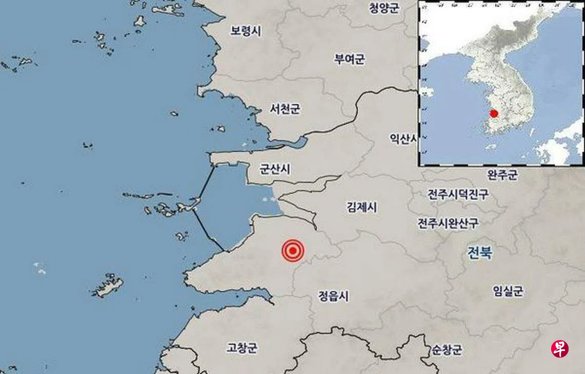 韩国气象厅说,星期三(6月12日)早上8时26分左右(新加坡时间12日早上7时26分左右),全罗北道扶安郡南偏西方向四公里处发生4.8级地震。