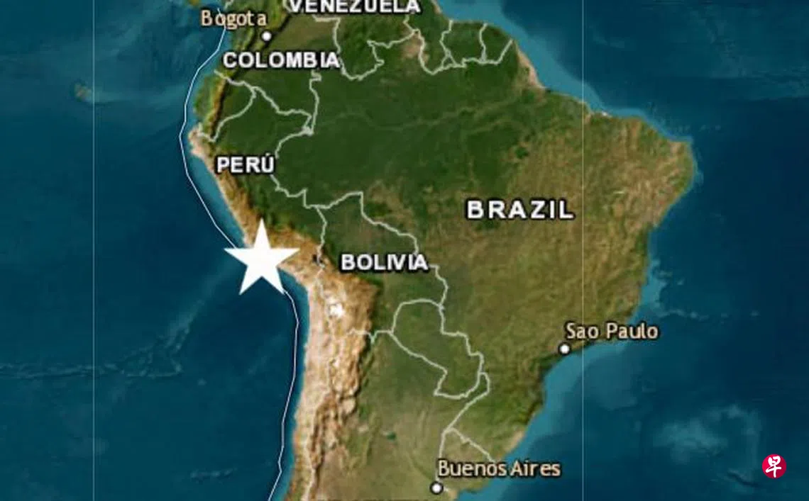 新华社报道,秘鲁地球物理研究所消息,地震发生于星期天上午9时47分(新加坡时间16日晚上10时47分),震中位于秘鲁南部阿雷基帕省查拉地区西南41公里处的海上,震源深度约25公里。