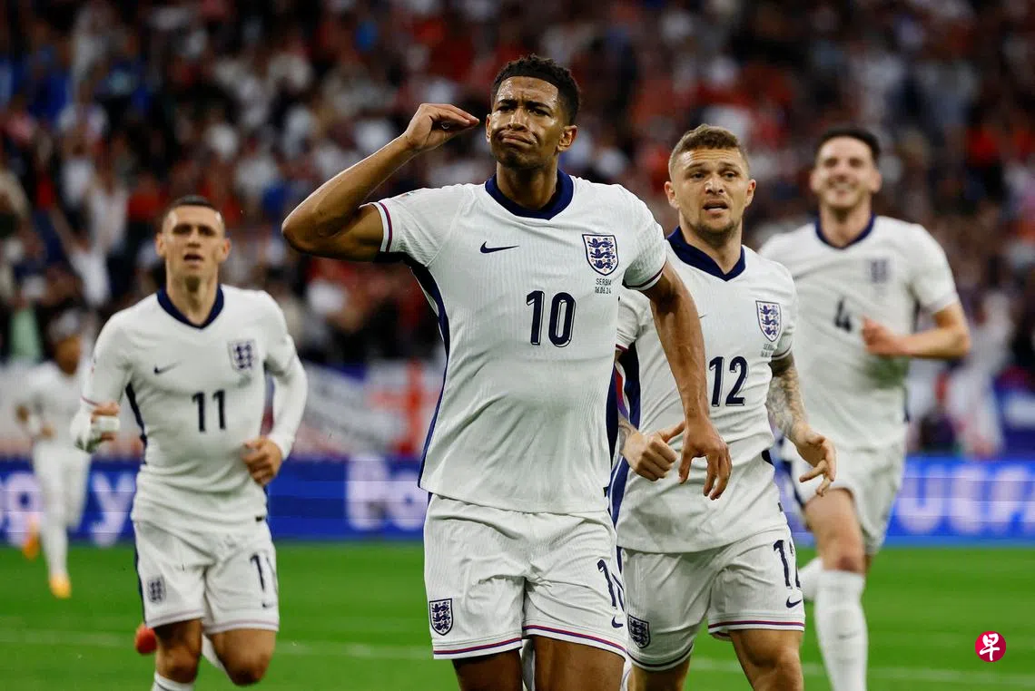 欧锦赛C组在新加坡时间星期一(6月17日)凌晨点燃战火,“三狮军团”英格兰凭借贝林厄姆(Bellingham)全场的唯一进球,以1比0击败塞尔维亚取得开门红。