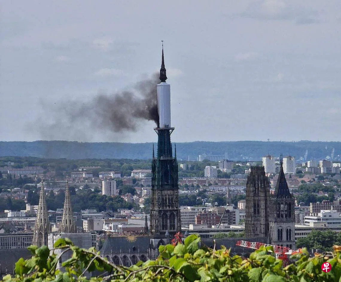 法国北部鲁昂市(Rouen)的鲁昂圣母主教座堂发生火患,教堂尖顶冒出滚滚浓烟。