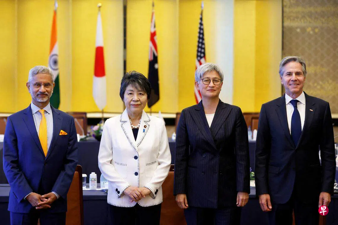 路透社报道,澳洲外长黄英贤、印度外长苏杰生、日本外长上川阳子和美国国务卿布林肯出席了星期一的会谈。