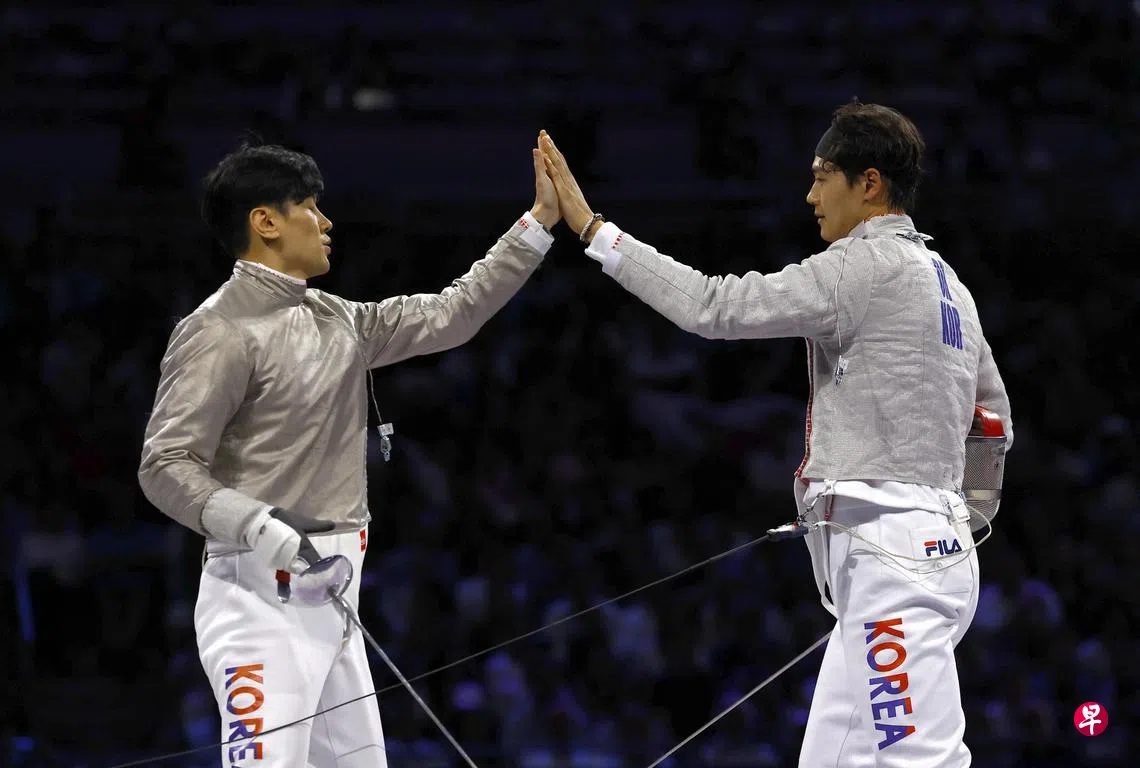 与三年前夺冠的队伍有些许不同,不过韩国佩剑手吴尚旭、具本佶与新队友朴相元、都庆东还是成功卫冕巴黎奥运会男子佩剑团体金牌。