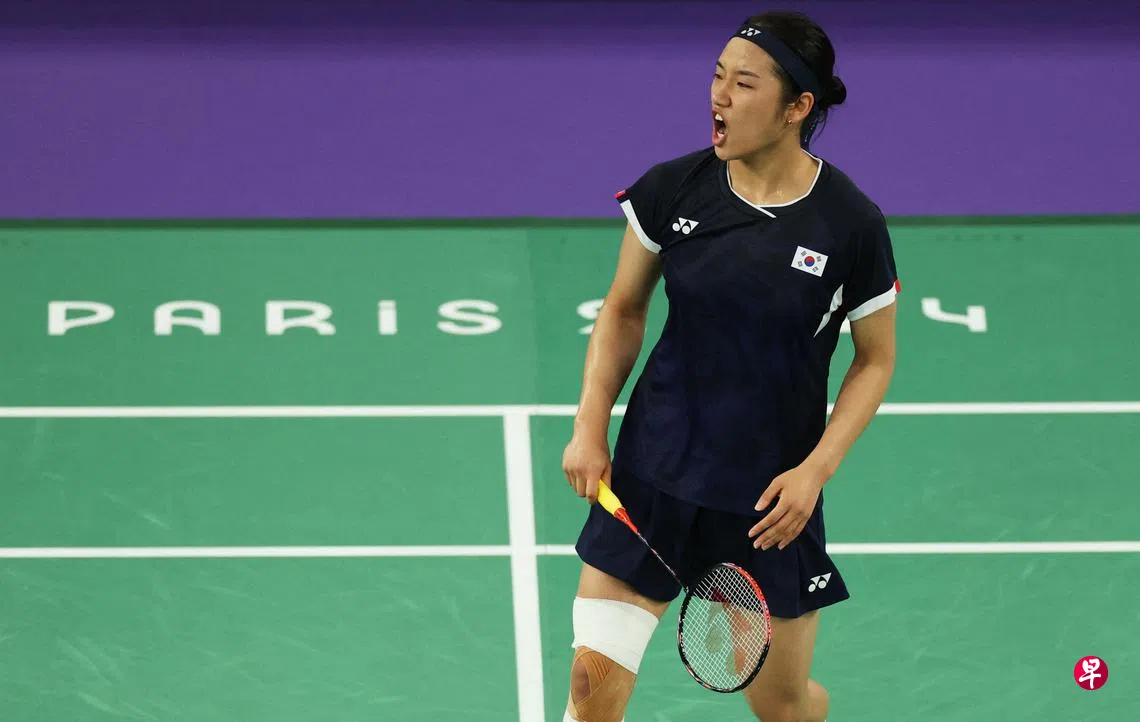 韩国世界第一羽毛球好手安洗莹星期天(8月4日)在巴黎奥运会羽毛球女单半决赛中,11比21、21比13、21比16逆转印度尼西亚的玛丽斯卡,闯入决赛。