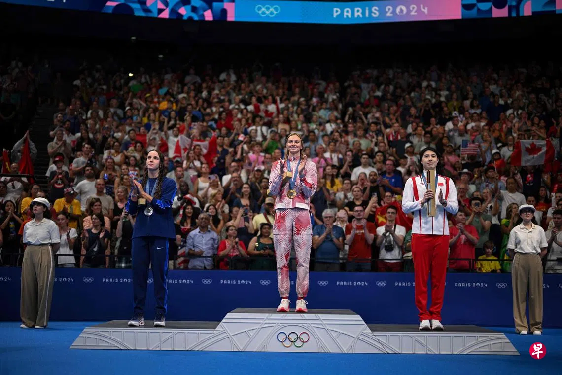 比赛结束后,前三名选手所在的泳道上面显示各自国家的国旗、姓名和序号,其中加拿大和中国的国旗清晰可见,仅美国国旗被打上马赛克。