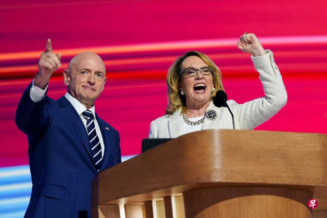在美国副总统哈里斯在民主党全国代表大会的闭幕夜登场之前,一些美国枪支受害者先后上台讲话,包括亚利桑那州参议员凯利的妻子吉福兹。