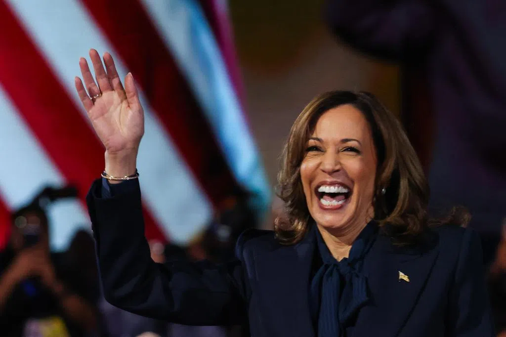 哈里斯一走上台就向群众、支持者和她的家人说谢谢,特朗普立即发帖说:“‘谢谢’说得太多、太快了。她是怎么了?”