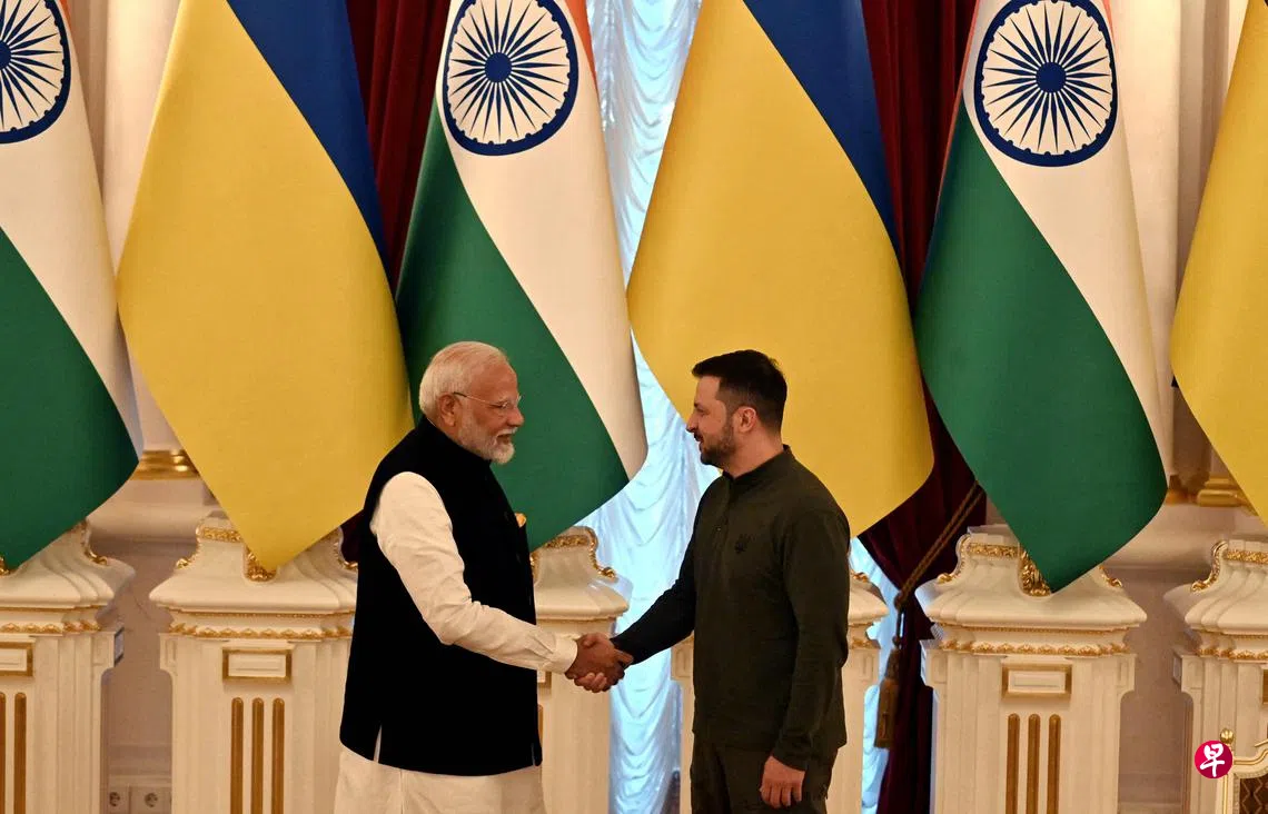 法新社报道,莫迪星期五(8月23日)在基辅与乌克兰总统泽连斯基会晤。他对泽连斯基说:“我们从第一天起就不是中立的,我们已经选择了一边,我们坚定地支持和平。”