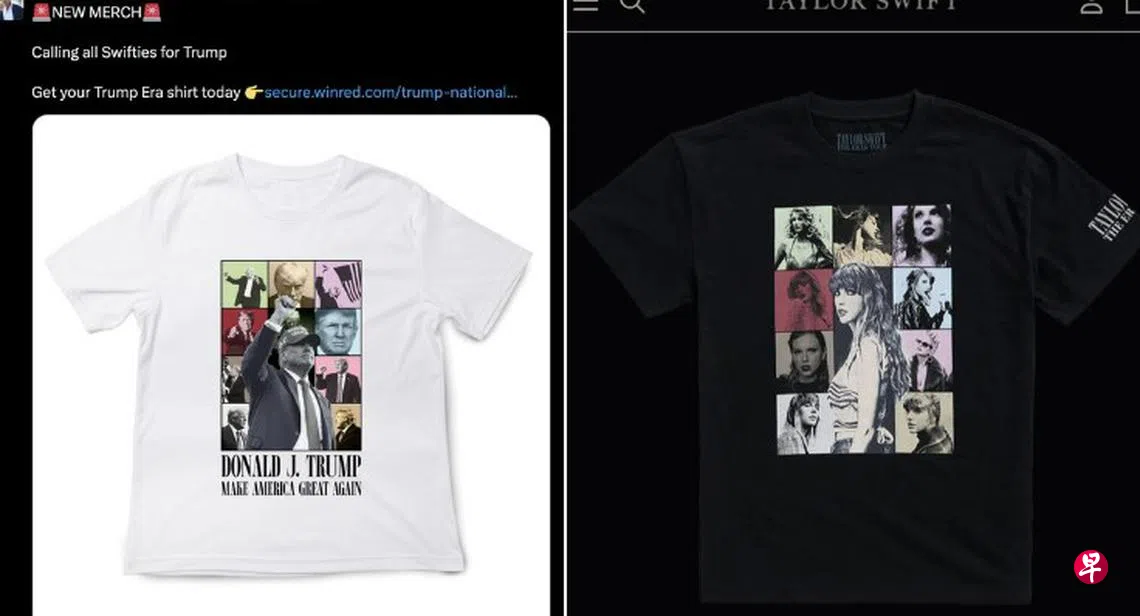 美国共和党总统候选人、前总统特朗普的竞选团队推出了一件竞选T恤,与乐坛天后泰勒丝“时代巡回演唱会”的T恤设计极为相似。