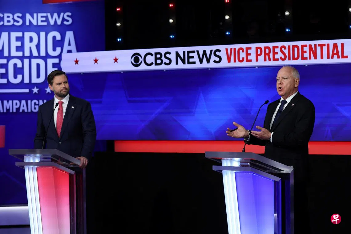 美国副总统候选人电视辩论星期二(10月1日)晚上9时(新加坡时间2日上午9时)在纽约市举行。在辩论一开始,两位候选人已站在各自的讲台。