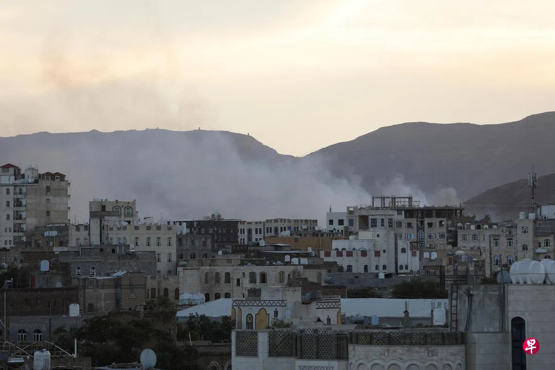 由胡塞武装控制的也门首都萨那市中心的军事设施遭美国战斗机轰炸。