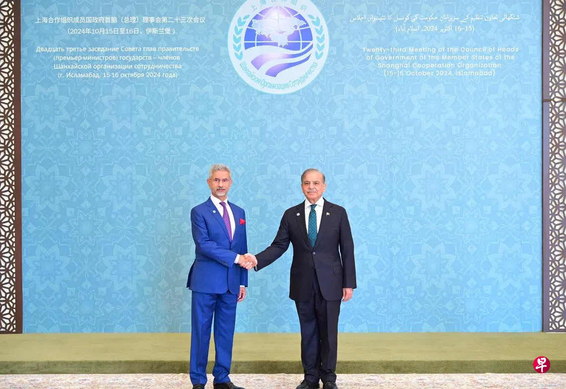 法新社报道,在上海合作组织的官方晚宴上,印度外长苏杰生与巴基斯坦总理谢里夫表情严肃地握手。