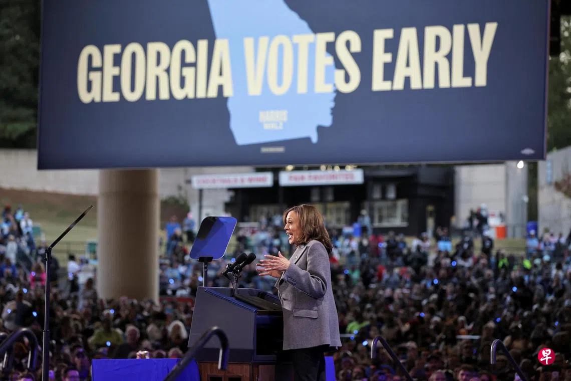 哈里斯在亚特兰大一座音乐厅里对约1万1000人发表演讲,再次抨击特朗普已精疲力竭,因此取消活动,并逃避再与她举行一场总统辩论。