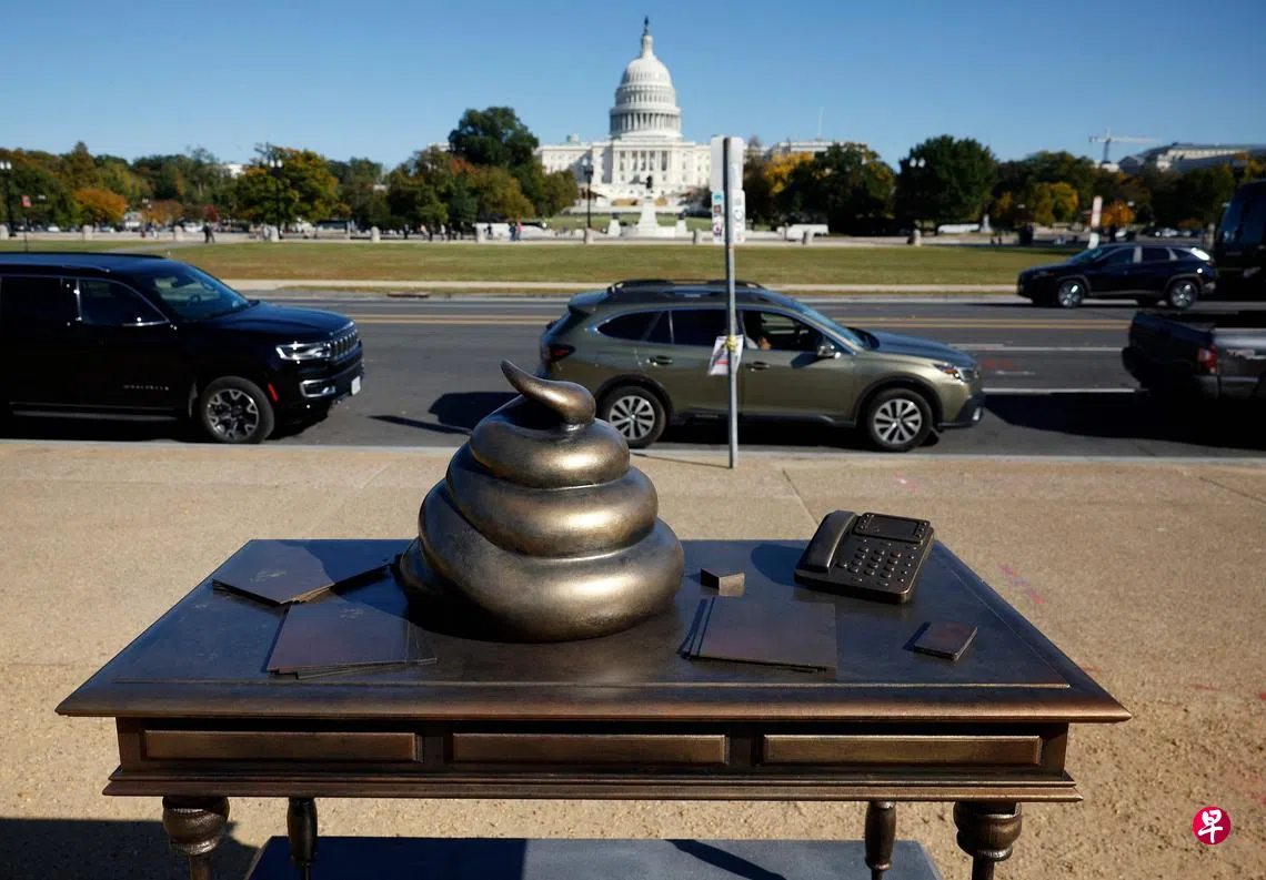 美国国会大厦附近出现一座引人注目的讽刺艺术装置,一张摆着一坨大便的黄铜色桌子,桌面上还摆着前众议院议长佩罗西的名牌。