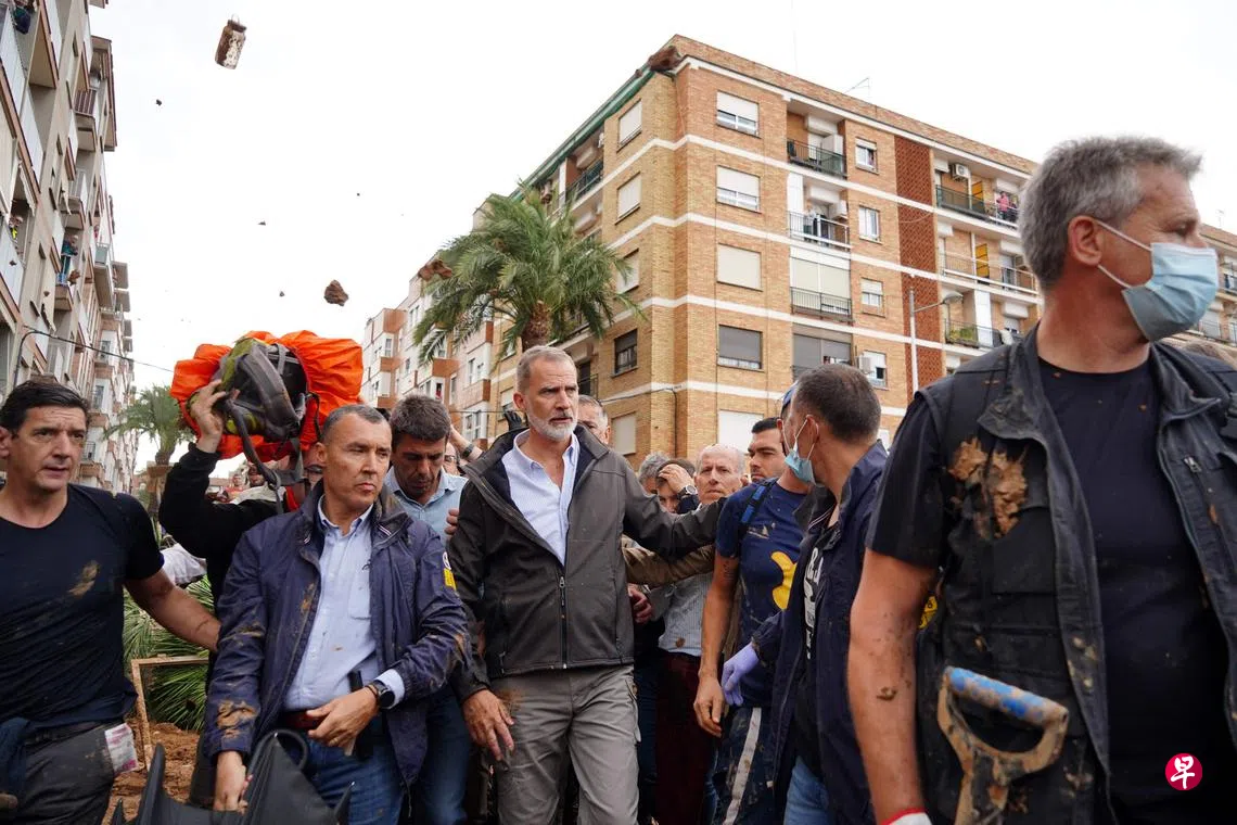 西班牙国王费利佩六世和首相桑切斯视察受山洪影响最严重的地区时,被数百名愤怒的群众包围和谩骂,还遭人扔泥土。