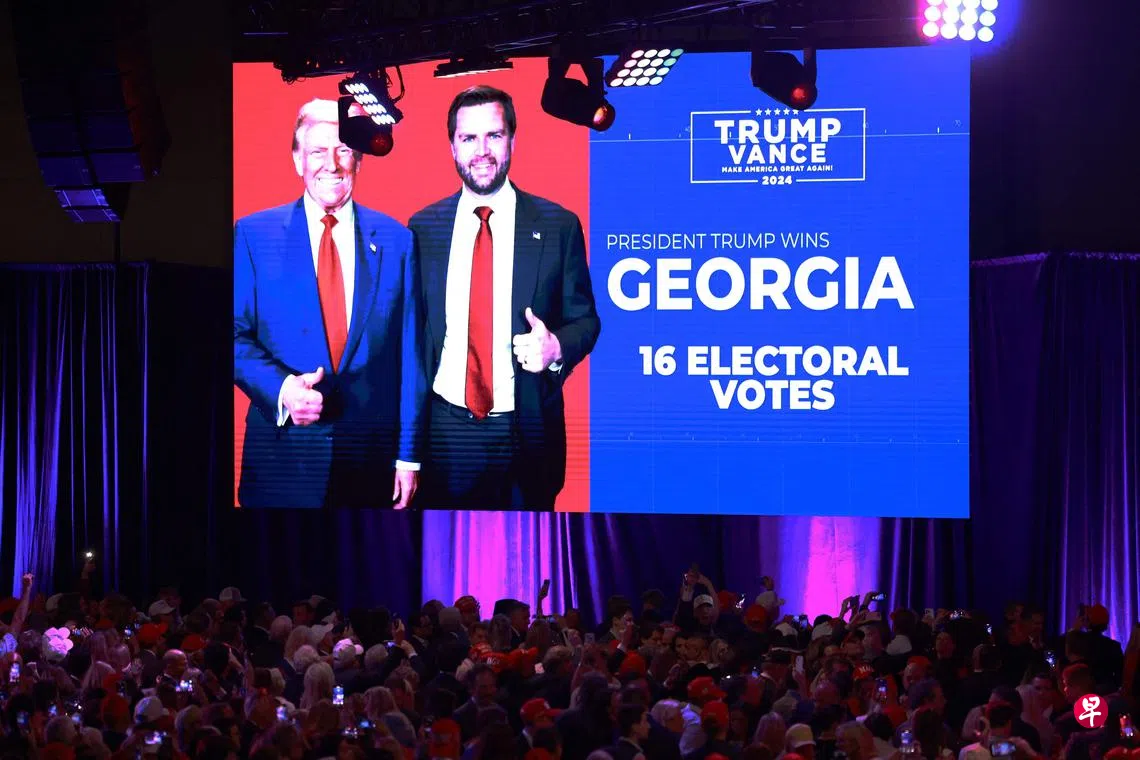 共和党总统候选人特朗普和竞选搭档万斯拿下有16张选举人票的佐治亚州。 (法新社)