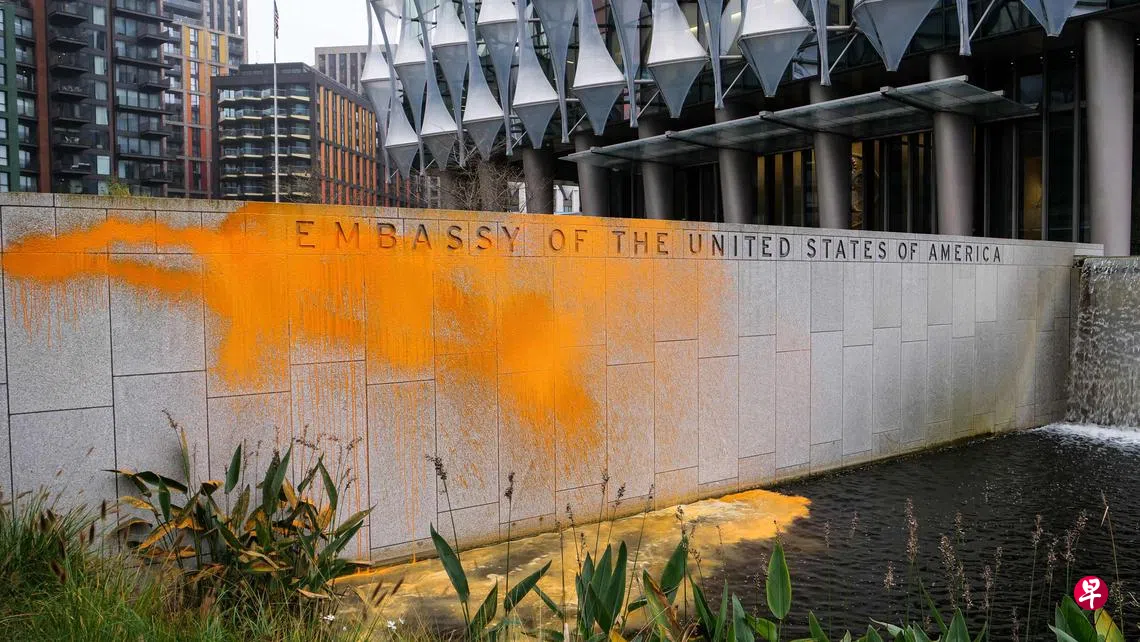 路透社报道,环保组织“停用石油”(Just Stop Oil)在社交平台X上发布的一段视频显示,其两名成员星期三 (11月6日)在大使馆的围墙上喷洒了橙色油漆。