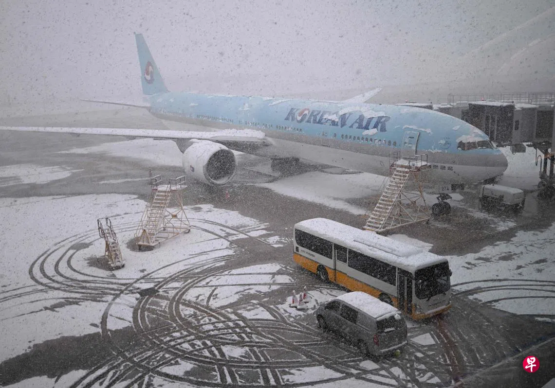 韩国机场公社和仁川国际机场公社星期三(11月27日)消息,截至当天上午9时,已有12个航班因大雪天气被取消,38个航班延误。