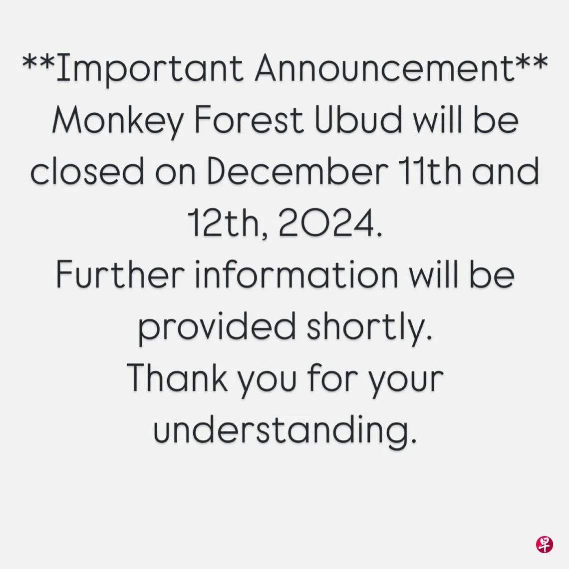 乌布猴林(Ubud Monkey Forest)发表声明,宣布星期三(11日)和星期四(12日)关闭。