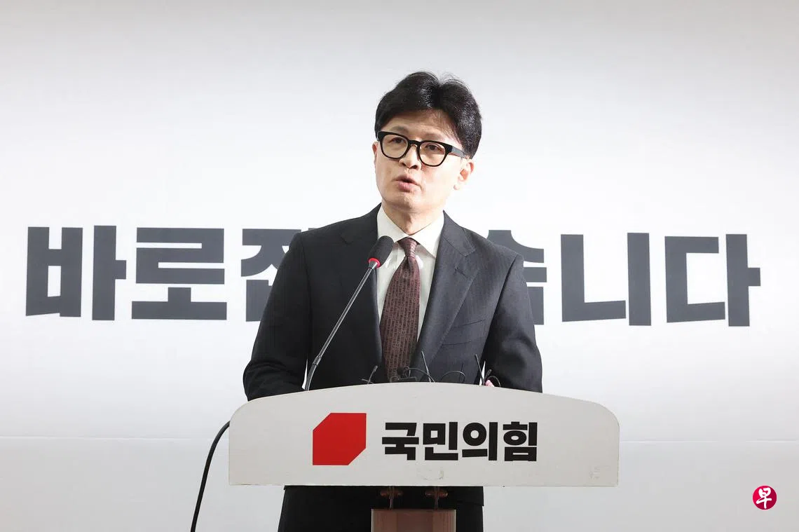 韩国执政党国民力量党党首韩东勋星期一(12月16日)辞去党首职务并道歉,但称不后悔支持弹劾总统尹锡悦。