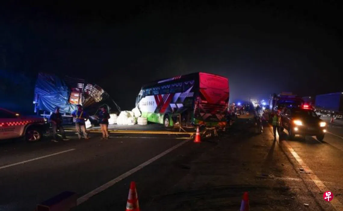 他说,由一名31岁男子驾驶的卡车,右前轮胎突然脱落,当时这辆卡车行驶在中间车道。旅游巴士撞到轮胎后失去控制,转向相反车道并撞上拖车,拖车冲向左车道后撞到路障,与一辆汽车和休旅车相撞。
