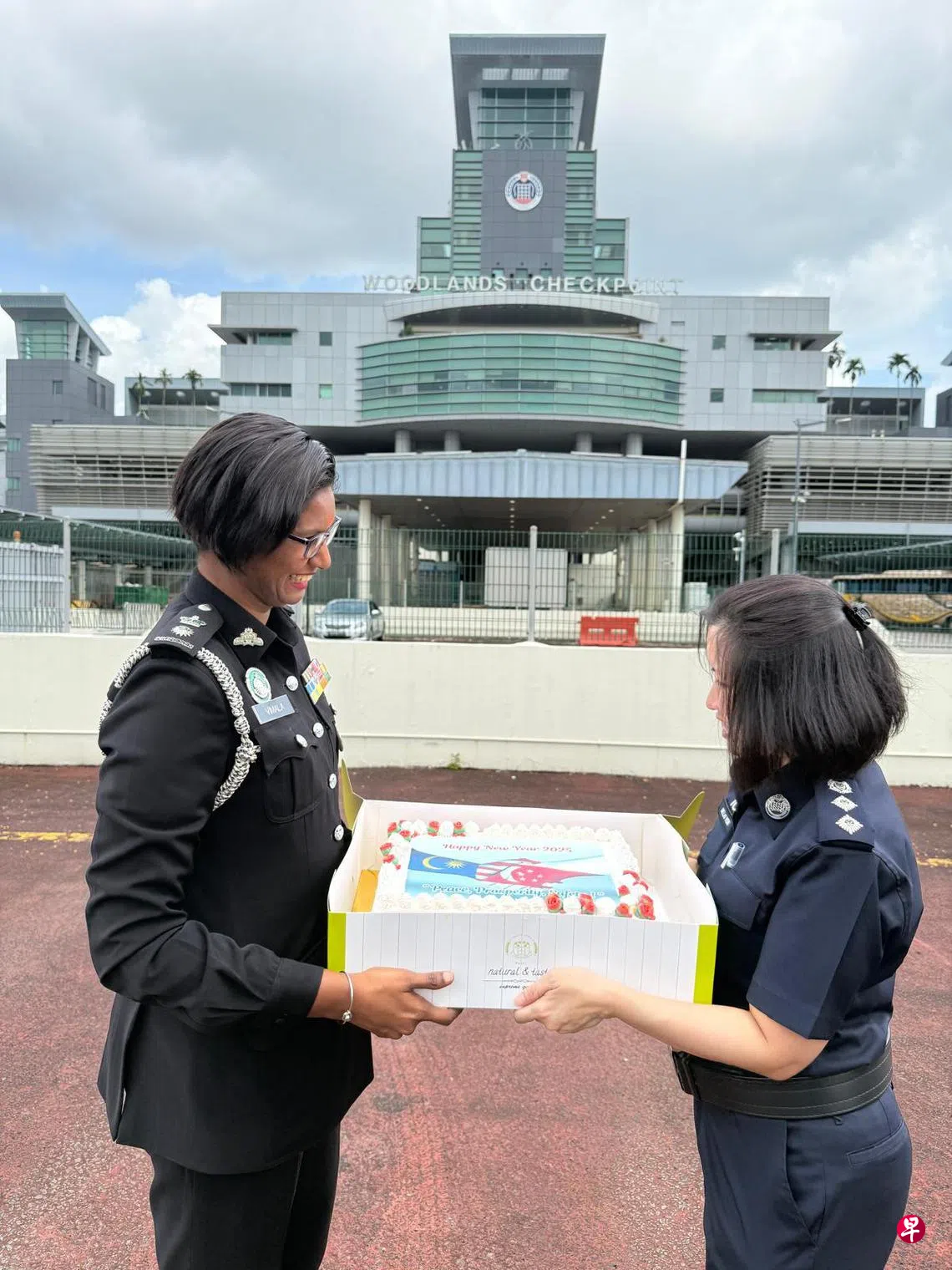 新加坡兀兰关卡官员星期二(2024年12月31日)中午越堤向新山关卡官员赠送新年礼物后,新山关卡官员星期三(2025年1月1日)也到兀兰关卡赠送贺年蛋糕。