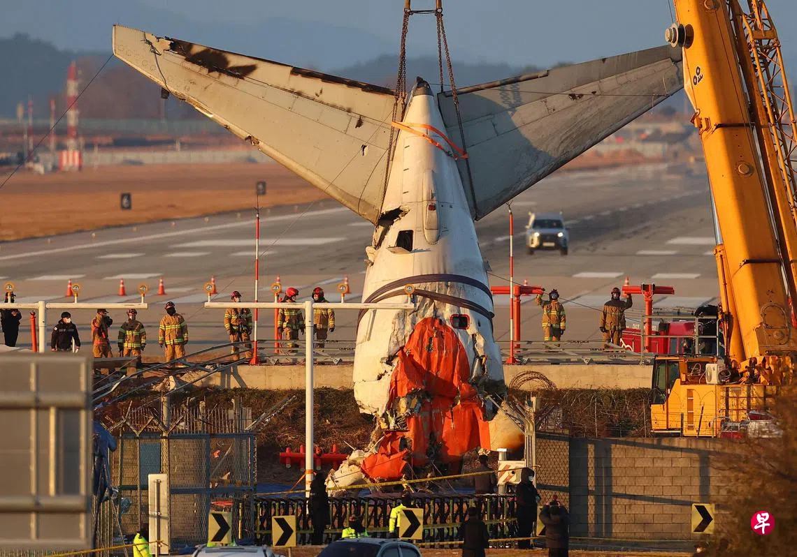 韩国调查人员星期五(1月3日)把上周在务安机场坠毁的济州航空公司飞机的尾部吊起,搜证并展开清理事故现场的工作。